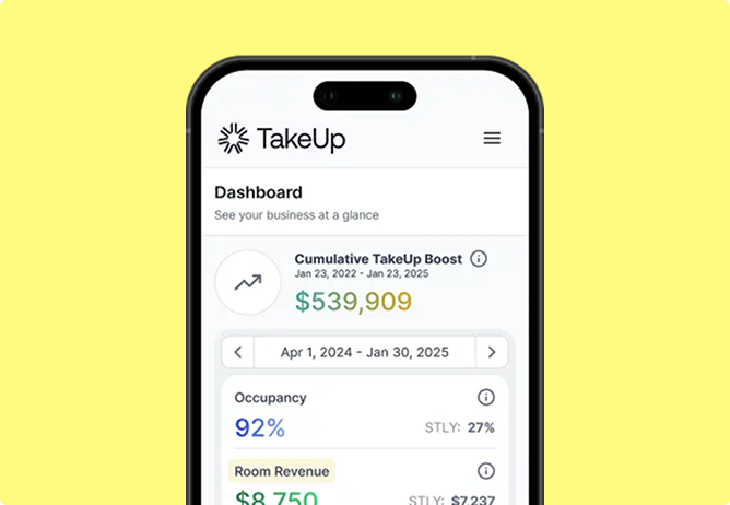 TakeUp’s AI-driven dynamic pricing tools keep you on pace to hit your revenue goals—automating smarter rate decisions (without the noise) so you can grow topline revenue and stay focused on what you do best: delivering standout guest stays.
